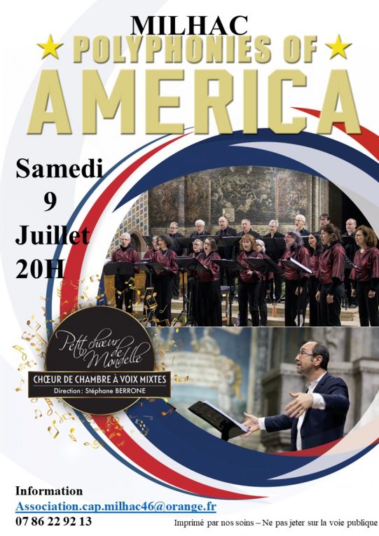 le samedi 9 juillet, au programme « Polyphonies of AMERICA » ; le Petit chœur de Mondelle, chœur de chambre à voix mixtes, est né du désir de Stéphane Berrone de réunir des amis musiciens pour travailler des œuvres d’un niveau exigent grâce au répertoire immense et magnifique du chant choral. Il réunit désormais un chœur de chambre allant de quinze à vingt-cinq chanteurs venus de la région (Tarn, Haute- Garonne, Lot, Gers et Aveyron). Ils répètent à la Grange de Mondelle de Saint-Sulpice, point de rassemblement convivial où ils aiment se retrouver pour travailler et passer d’agréables moments.               Un évènement exceptionnel à partager en soirée, salle des fêtes à Milhac à 20H                                                                                                                                                  Adultes 15€ – enfants de 10 à 15 ans 7.50€