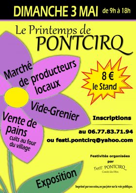 L’association Festi’ Pontcirq organise le « Printemps de Pontcirq » qui est un marché de producteurs locaux, artisans, un vide-grenier-brocante et une exposition au foyer rural de la mairie.