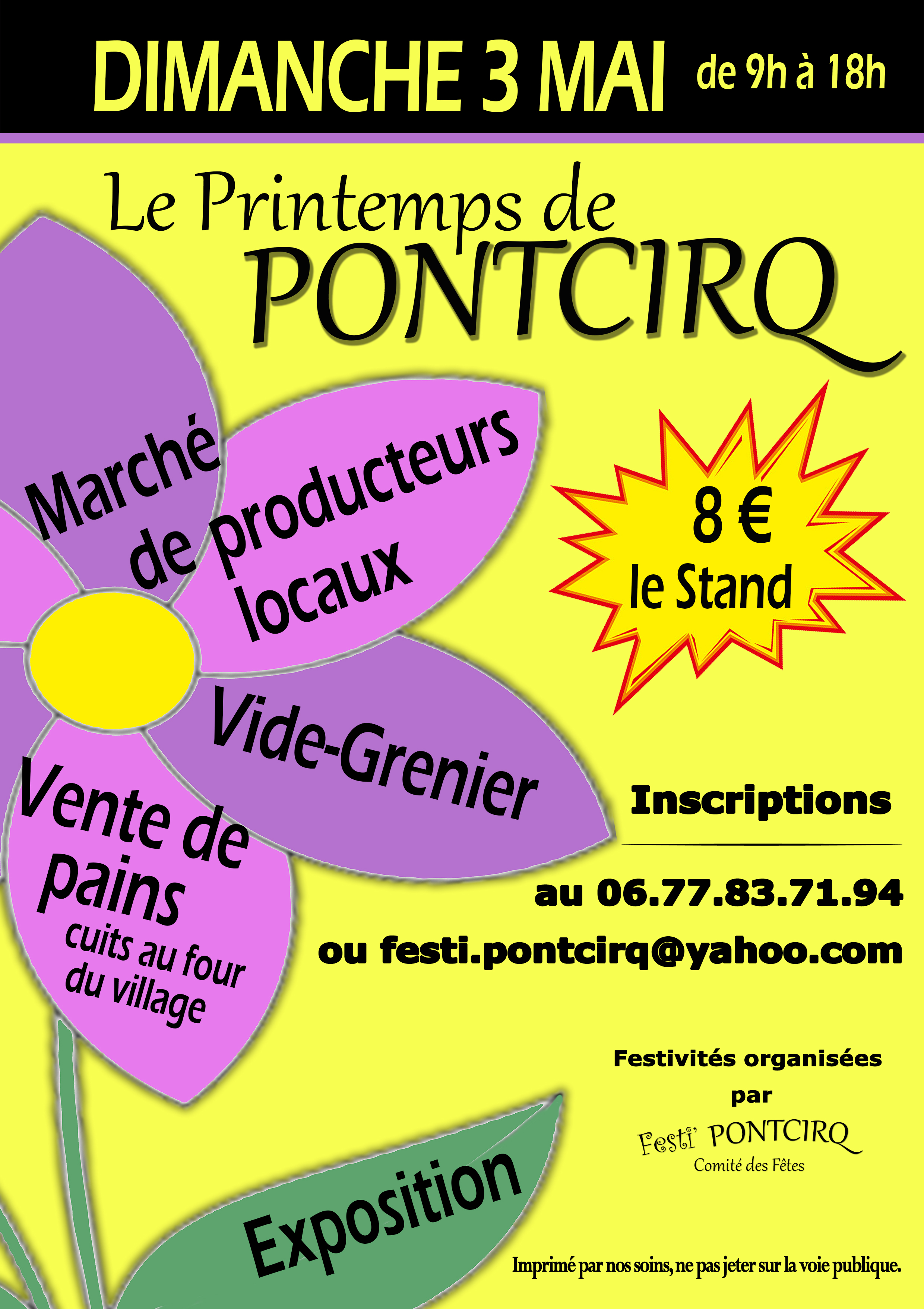 Les professionnels et particuliers peuvent s’inscrire pour réserver un stand pour un tarif unique de 8€ au 06 77 83 71 94 ou à festi.pontcirq@yahoo.com