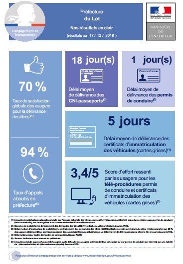 Dans le département du Lot (46), la préfecture, les 2 sous-préfectures, le commissariat et les 23 services de la gendarmerie nationale accueillant du public se sont engagés dans le programme « transparence sur la qualité et l’efficacité des services publics » . Vous trouverez ci-dessous les résultats de ces services. :