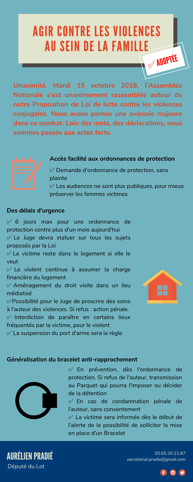 Jeudi 10 octobre le député Aurélien Pradié présentait son projet de loi visant à agir contre les violences faites aux femmes. Tous les articles ont été votés à l’unanimité, tous partis politiques confondus. Le vote solennel a lieu aujourd’hui. «Ce fut un moment intense pour moi, on a passé des heures en commission. C’est une proposition inspirée par les Lotois. J’ai reçu des familles concernées par les violences conjugales, ça vient de ce que j’ai pu entendre. On peut être un député de l’opposition et faire avancer les choses, et elles ne viennent pas que de Paris. On a espoir que d’ici la fin de l’année, le texte soit applicable», confie Aurélien Pradié. Le texte de loi prévoit la généralisation du bracelet anti-rapprochement, jusqu’à présent jamais mis en place. Concernant le logement, le député indique que le Lot sera le premier département à expérimenter un dispositif d’accompagnement des premiers loyers, cautions, dépôt de garantie pour les victimes et leurs enfants. «C’est un travail collectif, tous les groupes politiques ont bien contribué. Il s’agit d’une cause trop importante pour faire de la politique politicienne. On a retravaillé sur l’ordonnance de protection, de la ramener à six jours au lieu de six mois et demi. Le rôle du député c’est aussi de passer du temps sur le terrain. Le Grenelle des violences conjugales pour l’instant n’a apporté que des mots. En parler, c’est bien, mais ce n’est pas suffisant», déclare-t-il. Le 10 octobre, son décompte des femmes victimes des coups de leur conjoint ou ex-conjoint avait marqué les esprits.