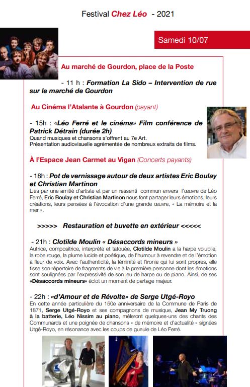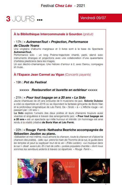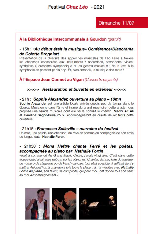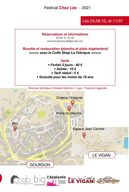 Le service culturel de la Communauté de Communes Quercy Bouriane vous invite au Festival Chez Léo les 9-10 et 11 juillet Publié le mardi, 6 juillet 2021mardi, 6 juillet 2021 par Bibliothèque Intercommunale Gourdon .