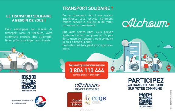 Depuis le 15 Janvier ! une nouvelle solution de mobilité rurale ( ATCHOUM) proposée sur la bouriane (CCCS et CCQB), permet de combiner à la fois covoiturage régulier (ex : domicile-travail) et transport solidaire pour les personnes non-véhiculées ou isolées.