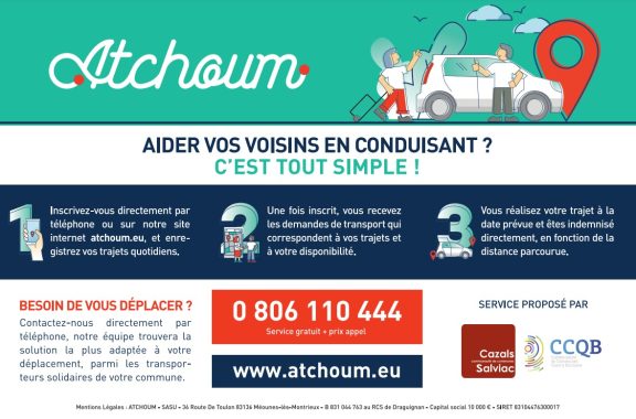 Pour réaliser un trajet aller-retour en transport solidaire, il suffit d’indiquer vos disponibilités, auprès d’ATCHOUM directement par téléphone au 0806 110 444 (coût d’un appel local, service d’appel gratuit) ou via le site internet : « www.atchoum.eu ». ATCHOUM s’occupe ensuite de mettre en relation conducteurs solidaires et passagers non-véhiculés ou isolés. C’est une façon concrète de renforcer le lien social et de lutter contre l’isolement.