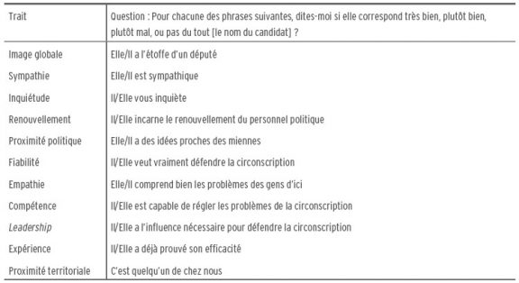 Ils ont pour cela travaillé sur une tableua de mesures des évaluations relatives aux 11 traits habituellement utilisés dans les enquêtes portant sur l’image des candidats (tableua ci-dessous).