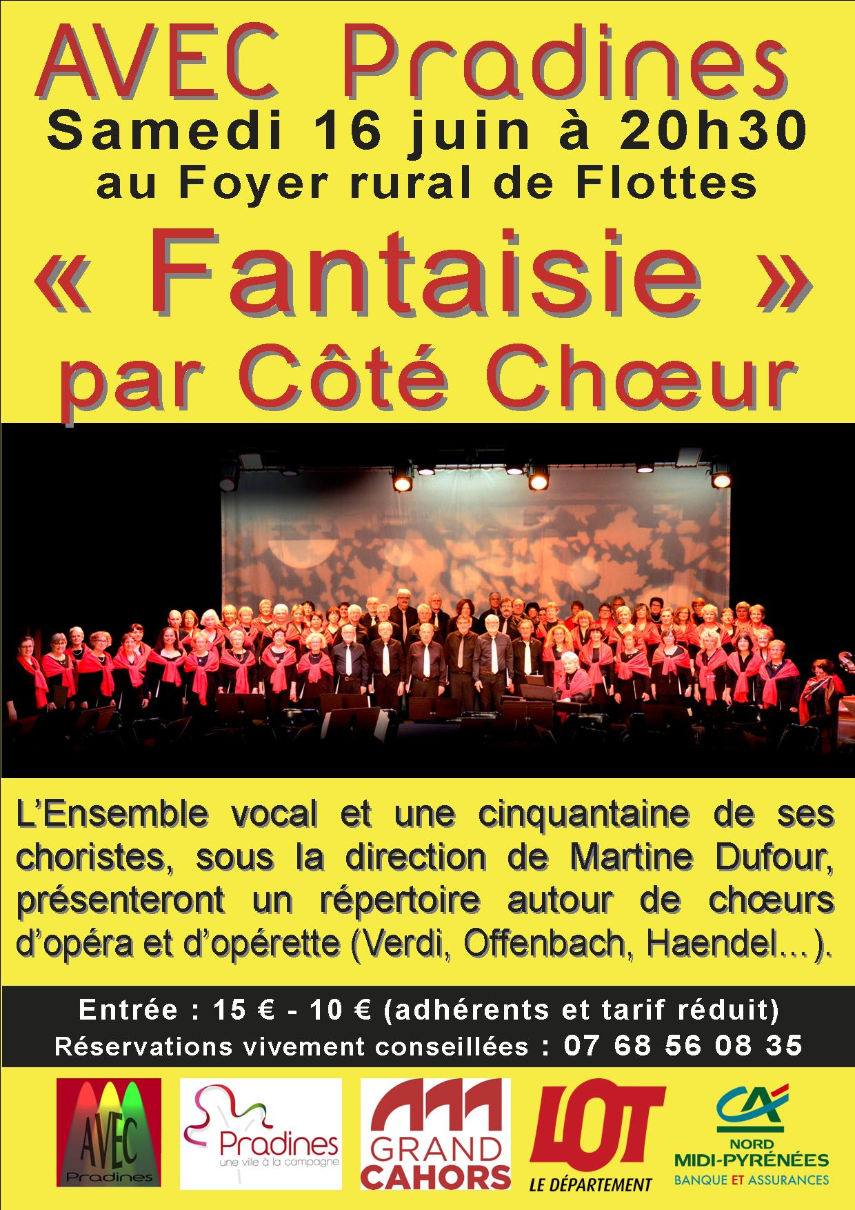 Après le beau succès de « Jacouti attend la retraite », AVEC Pradines donne de nouveau rendez-vous au Foyer rural de Flottes ! L‘Ensemble vocal Côté Chœur depuis vingt ans enchante les mélomanes du Grand Cahors et d’ailleurs. Le samedi 16 juin ce sera donc, à Flottes et à 20h30 que le public pourra découvrir ou retrouver la cinquantaine (ou plus) de chanteurs qui interpréteront « Fantaisie » avec légèreté et humour…