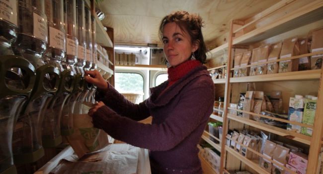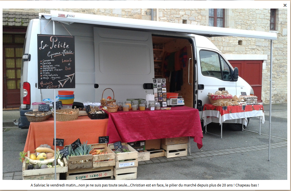 Myriam Scattolin dans son épicerie mobile propose des produits bio et locaux. Elle sillonne les villages et les marchés. Pour la rencontrer, rendez-vous sur le marché de Salviac le vendredi matin sur le marché de Labastide-Murat les 2e et 4e lundis matin du mois, à Puy-l’Évêque le mardi matin (en été) et sur la commune des Junies l’après-midi. Enfin, Myriam Scattolin est aussi sur celui de Pradines l’après-midi. Vous pouvez la contacter sur son site.