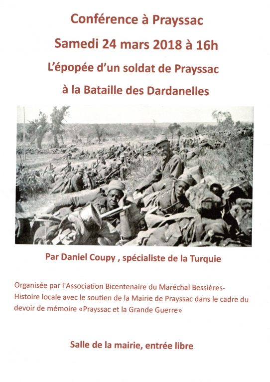 Daniel Coupy, grand connaisseur de ces régions évoquera la bataille des Dardanelles notamment à travers le destin de soldats prayssacois qui ont vécu cette tragédie. Cet épisode méconnu particulièrement tragique permettra de mieux comprendre ce que fut le Front d’Orient. Contact et renseignements 06 03 17 70 32
