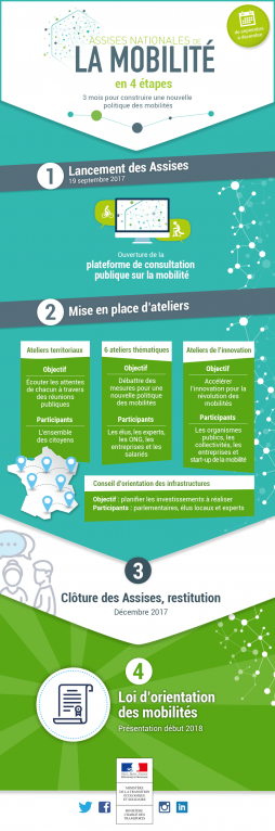 Les Assises nationales de la mobilité visent à identifier les besoins et les attentes prioritaires des citoyens sur le thème du transport dans la vie quotidienne. La consultation se déroule en plusieurs étapes et sous différentes formes sur une période de trois mois. Elle aboutira à une loi d’orientation des mobilités présentée début 2018.
