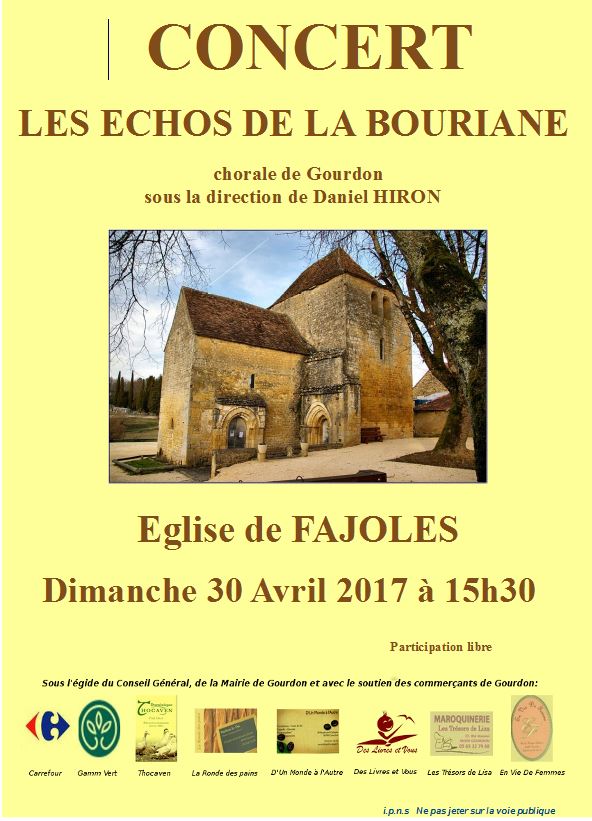 Dimanche 30 avril à 15h30, c’est dans l’Eglise Notre Dame de l’Assomption, à FAJOLES, que la chorale de Gourdon « Les Echos de la Bouriane » proposera un concert .