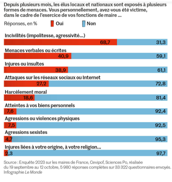 Entre 2021 et 2022, les atteintes verbales ou physiques à l’encontre des élus locaux, notamment les maires et leurs adjoints, ont connu un bond de 32 %, passant de 1 720 à 2 265 en novembre 2023 . A noter que toutefois, les violences physiques restent minoritaires.