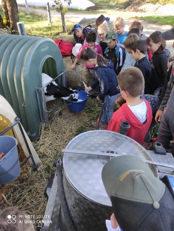 Madame Bladié, mère de Monsieur Bladié, nous confiait : «Autrefois, avec mon mari, il y a 50 ans, nous avons commencé l’élevage avec seulement 4 vaches. Actuellement, nous en élevons 250, tout âge confondu. » Monsieur Bladié élève uniquement des vaches laitières. Le métier d’agriculteur est un métier à multiples facettes. Travail de la terre, gestion administrative et comptable, conduite et réparation des équipements, élever et soigner les animaux font partie du quotidien de l’agriculteur. Au programme de cette journée, les élèves ont nourri les veaux, visité la ferme, goûté du lait au chocolat et de la tomme des Pyrénées fournis par la coopérative Sodiaal à Montauban et enfin, dégusté le lait cru des vaches des Cabrayries. Monsieur Bladié a su présenter son métier avec passion, si bien que certains élèves sont repartis avec l’idée de devenir agriculteur. Mission réussie ! Après avoir trouvé réponses à leurs questions, les élèves sont retournés, enchantés, dans leurs écoles respectives avec quelques petits cadeaux et des papilles gustatives comblées.