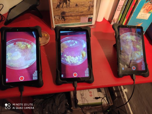 A l’école, les blobs sont arrivés sous la forme de sclérote, c’est-à-dire en état de dormance. Pour commencer à l’étudier, il faut le réveiller en le nourrissant de flocons d’avoine et en l’humidifiant de quelques goutes d’eau. Une fois réveillé, les élèves ont pu observer sa croissance et ont commencé à mener une expérience, celle du nom de « la cafétéria.» Pour cette expérience, il faut créer des menus pour le blob (4-5 aliments maximum) et constater ses préférences. Les enfants sont donc entrés dans la réelle démarche scientifique. Ils ont émis des hypothèses, fait l’expérience et l’ont filmée à l’aide de tablettes et le lendemain, ils ont interprété le petit film et ont rédigé une conclusion. La précision est de rigueur, les élèves manipulent le blob à l’aide d’outils de laboratoire (boites de pétri, pinces, pipettes), ce dernier dort dans sa blob box (boite) car il ne doit être en aucun cas en contact avec la lumière du soleil, cette dernière le tuerait.