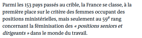 La France se classe au premier rang en ce qui concerne le nombre de femmes ministres.