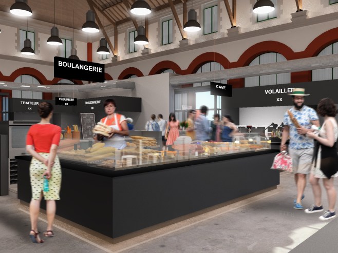 – une réorganisation des étals pour les structurer par univers : produits frais au nord, produits transformés au centre, restauration et convivialité au sud