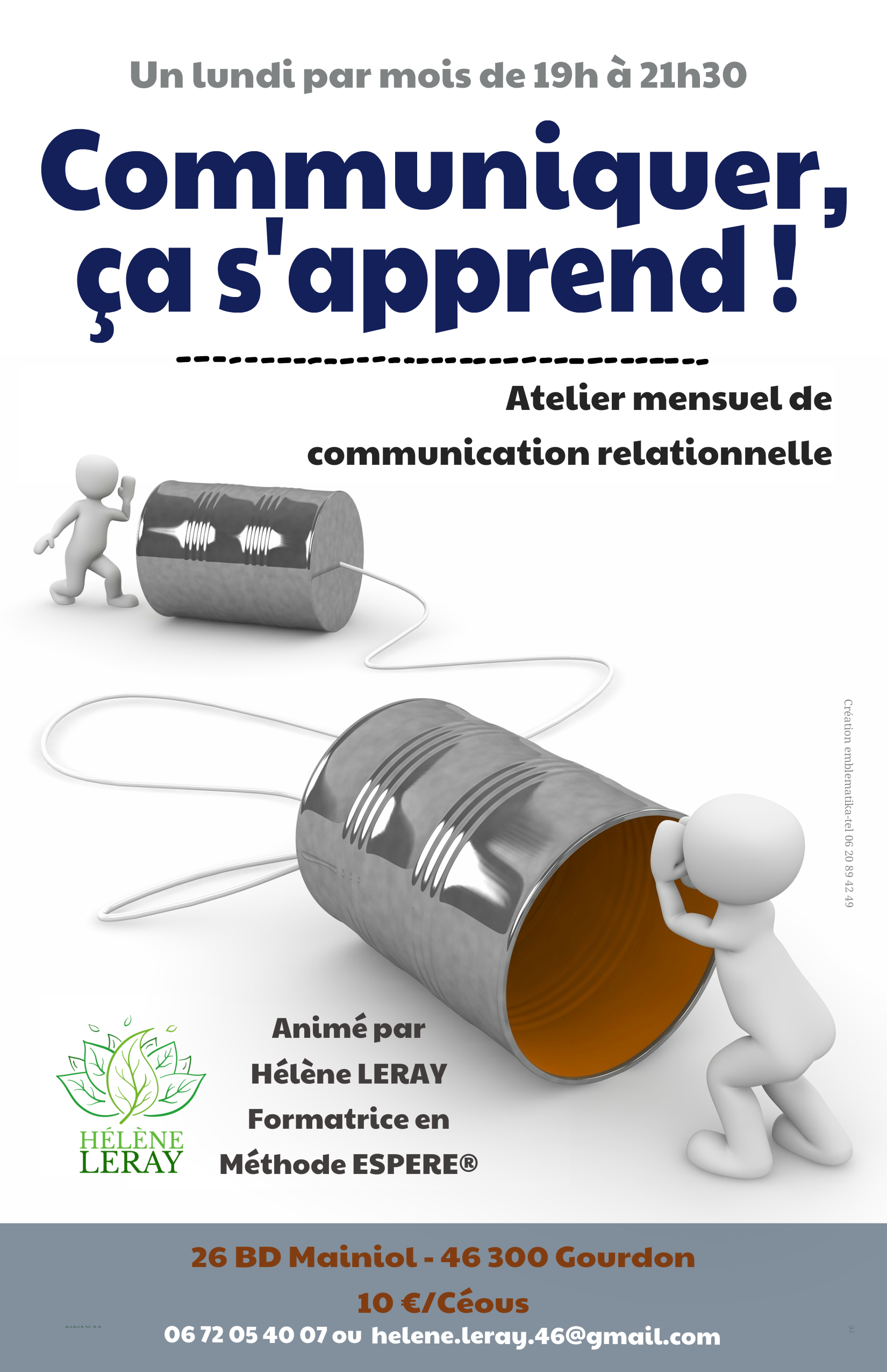 Nouvelles dates d’ateliers de communication relationnelle un lundi soir par mois à Gourdon, de 19h à 21h30, animés par Hélène LERAY, formatrice en Méthode ESPERE® : lundi 6 janvier, lundi 3 février, lundi 2 mars