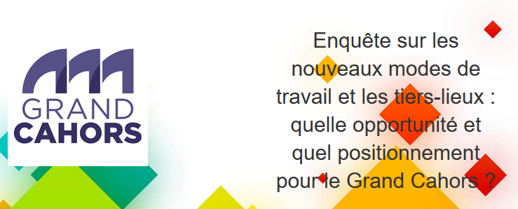 La Communauté d’agglomération du Grand Cahors lance une enquête intitulée « Les nouveaux modes de travail et les tiers-lieux : quelle opportunité et quel positionnement pour le Grand Cahors ? » (ici) présentée ainsi :