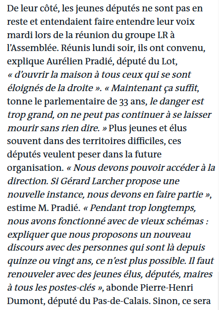 Sur l’état de la droite républicaine, le parlementaire lotois a commencé de livrer aux instances nationales de son parti son analyse qui va sûrement faire grincer des dents chez les caciques de son mouvement. « J’ai dit aux représentants nationaux et je le répéterai à Laurent Wauquiez, qu’il était grand temps que la droite se renouvelle dans ses visages et dans ses idées. Il faut qu’elle redevienne une droite populaire. On sort sonné de l’élection, on ne peut pas se reconstruire en claquant des doigts. Il va falloir se mettre au boulot ».