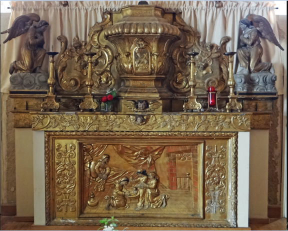 retable en bois doré Autel avec panneau sculpté sur la « Naissance de la Vierge »