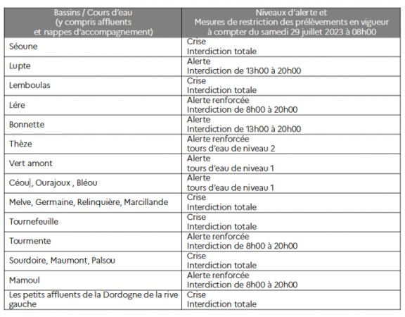 À la suite d’une information des partenaires concernés, et en tenant compte des prévisions de Météo France, Mireille Larrède, préfète du Lot, a décidé de prendre les mesures de limitation des usages de l’eau dans le département, comme présentées dans le tableau ci-joint.