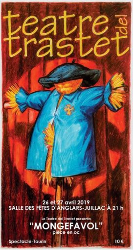 Après un franc succès régional avec la pièce “N’en porterem pas lo dòl”, la compagnie du “Teatre del Trastet” est de retour pour une nouvelle pièce toute en oc “Mongefavol”  à la salle des fêtes de Anglars-Juillac les 26 et 27 Avril prochains. Le tourin de rigueur sera servi après la représentation.