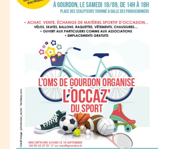 Le samedi 18 Septembre, de 14h à 18h, l’OMS de Gourdon propose L’Occaz’ du Sport, sur la Place des Sculpteurs Tournié et Salle des Pargueminiers.