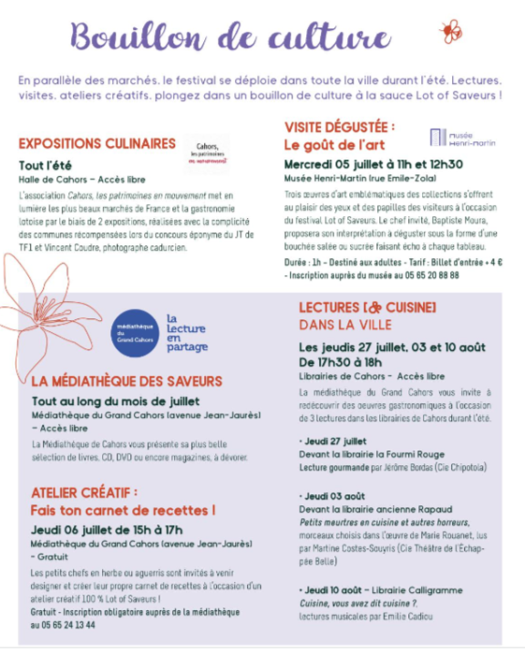 Lot of Saveurs pourra encore compter sur ses fidèles partenaires tels que le Comité de Promotion des Produits du Lot, les chefs des Bonnes Tables du Lot, les Artisans du goût lotois ou encore l’Union Interprofessionnelle des Vins de Cahors entre autres !