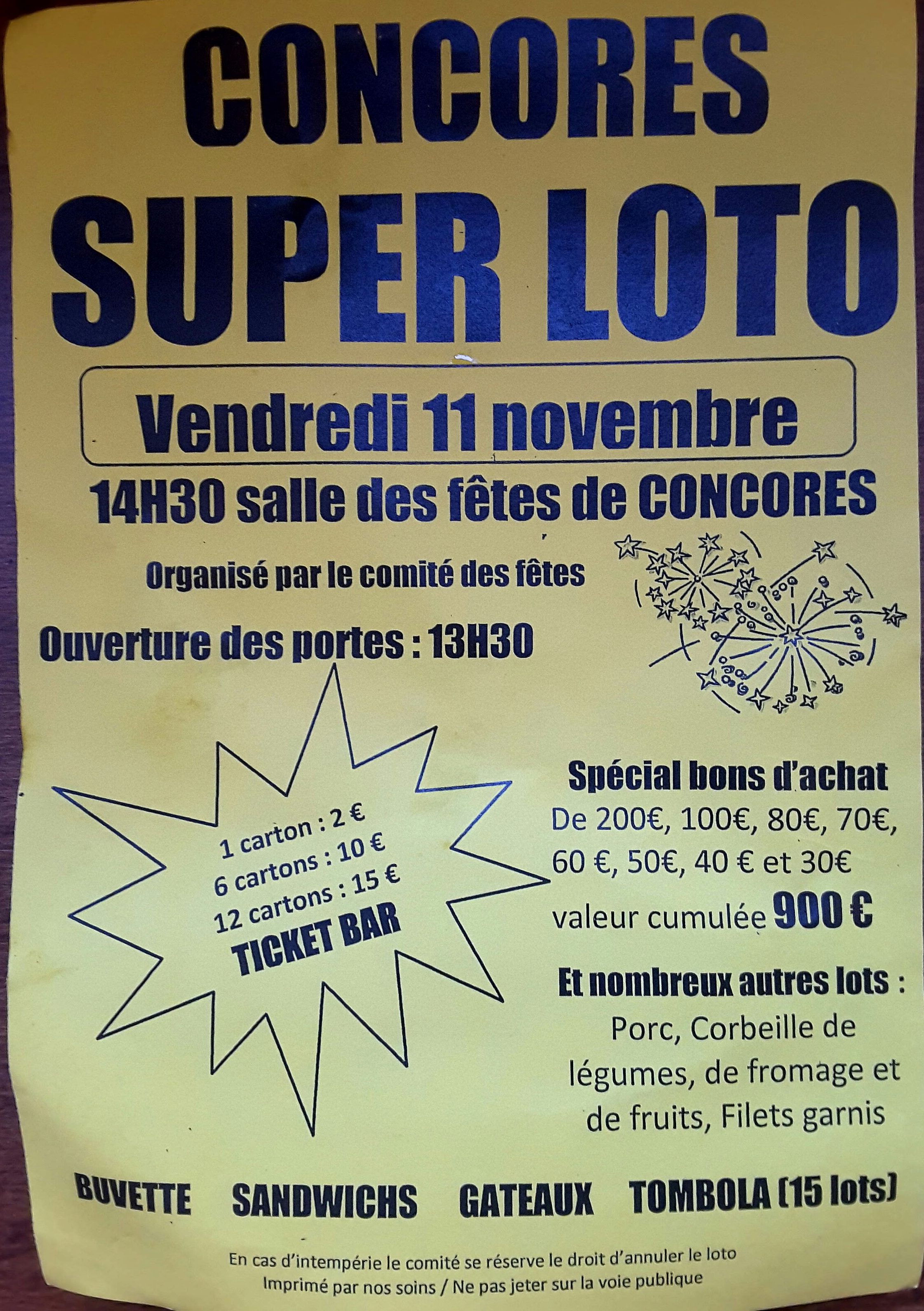 Le vendredi 11 novembre à 14h30 tous les bénévoles du comité des fêtes invitent à venir participer à son grand loto qu’ils organisent. Les portes de la salle des fêtes s’ouvriront à partir de 13h30 pour accueillir les participants.