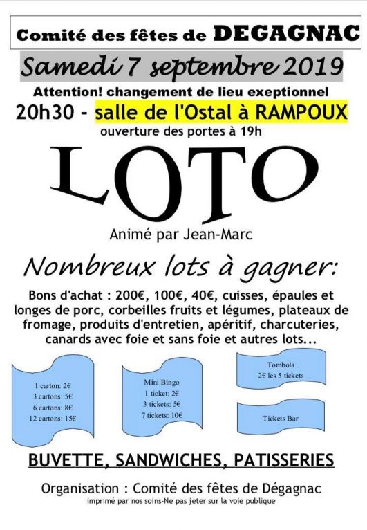 Le comité des fêtes de Dégagnac vous invite à son traditionnel loto de septembre animé par Jean-Marc.