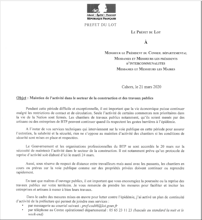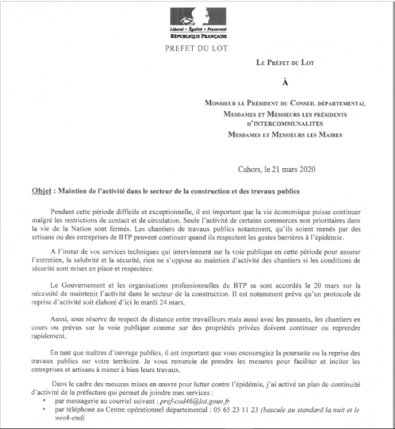 Serge Rigal Président du département: « j’ai donc décidé l’arrêt de nos chantiers conduits en partenariat avec des entreprises du secteur privé, sur un certain nombre de bâtiments du Département (les collèges en particulier) et sur nos routes. Il en va tout autant de la protection des salariés des entreprises que de celle de nos agents. Une seule dérogation sera acceptée. Elle concernera les entreprises qui s’engageront à travailler avec un seul salarié sur le chantier, en l’absence de toute autre entreprise. Nos partenaires économiques lotois me comprendront et savent combien notre collectivité s’est toujours efforcée, autant que possible, d’accompagner les activités, qu’elles soient industrielles, artisanales, commerciales, agricoles ou touristiques. Nous avons toujours su répondre présent, dans le cadre de nos missions. Nous savons tous aujourd’hui que se déplacer, travailler en collectif, y compris sur un chantier, malgré toutes les précautions, augmentent les risques de propagation du virus. Pourtant, notre premier combat, aujourd’hui est bien là. Nous devons le mener avec détermination. Je le répète : c’est une question de vie ou de mort. Il sera temps, après, de se relever et de participer au redressement de l’économie du pays. Sachez que le Département y contribuera aussi et n’attendra pas la fin de cette crise pour s’engager en faveur d’initiatives solidaires dont je ne manquerai pas de vous faire part prochainement. Par ailleurs, je demande au monde agricole lotois et aux grandes surfaces alimentaires de notre territoire de travailler très étroitement ensemble. Les grandes surfaces s’honoreraient à privilégier systématiquement les circuits courts. Il faut pour cela que nos agriculteurs s’organisent collectivement. Il en va de la survie d’un pan de notre économie lotoise ».