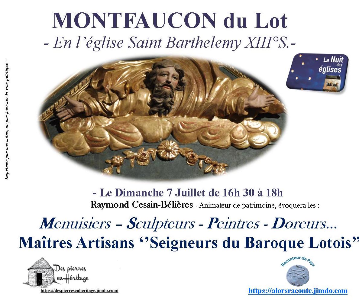 Dans le cadre des Nuits des Eglises à Montfaucon du Lot, le dimanche 7 Juillet  16h 30 en l’église St Barthélémy, sera évoqué les constructeurs de retable : Menuisiers, Sculpteurs, Peintres Doreurs…