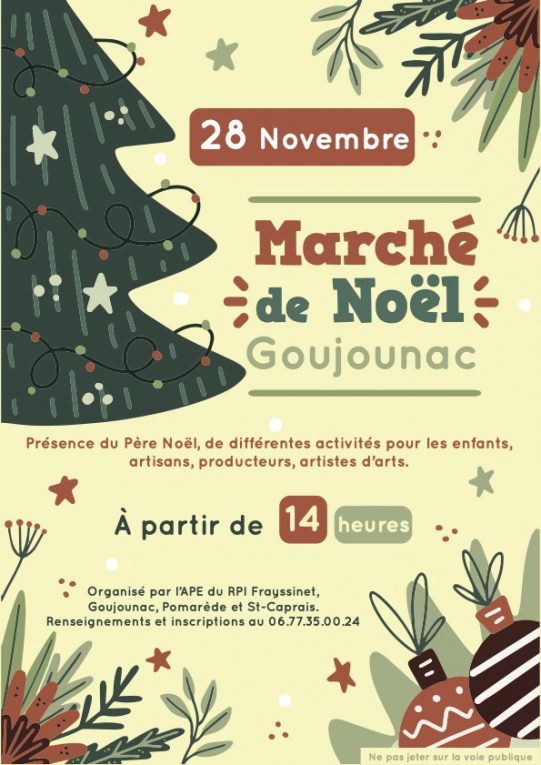 L’association des parents d’élèves du RPI de Frayssinet le Gélat/ Goujounac/Pomarède/Saint Caprais organise le dimanche 28 novembre à partir de 14 heures un marché de Noël à GOUJOUNAC qui se tiendra sous la halle et dans la salle des fêtes.