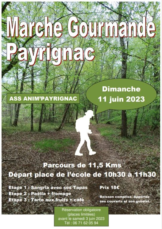 L’association Anim’payrignac organise sa 2ème MARCHE GOURMANDE  au départ de l’école. Parcours balisé avec 3 points d’étapes Apéro/ Plat/ Dessert.