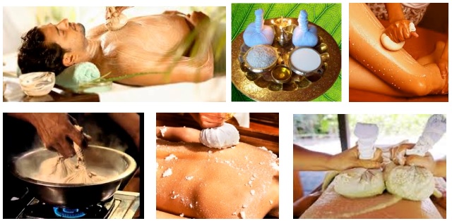 Le corps entier est d’abord massé avec de l’huile sélectionnée en fonction de la constitution de la personne, puis massé avec les pochons de riz trempés dans le lait et la décoction de plantes.