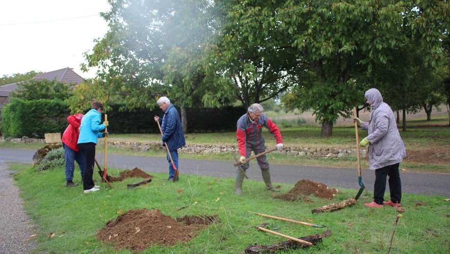 Lundi 5 octobre, bravant le mauvais temps, un groupe de conseillers municipaux et Milhacois, armés de pelles, bêches et pioches, ont creusé et désherbé l’espace public autour de la gariotte pour préparer les futures plantations paysagères. Deux premiers après-midi avaient déjà permis les tailles d’arbustes du parc de stationnement et un repérage des futurs travaux de jardinage.