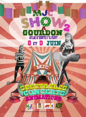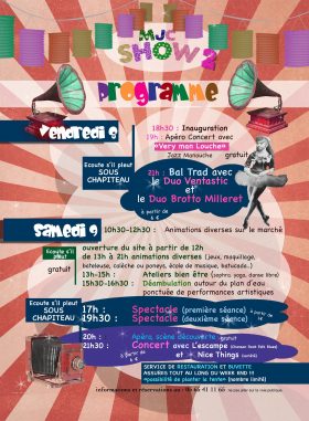 Programme des 2 jours de fête, en clôture de saison de la MJC qui se dérouleront à Gourdon au Lac « Ecoute s’il pleut » avec Chapiteau :