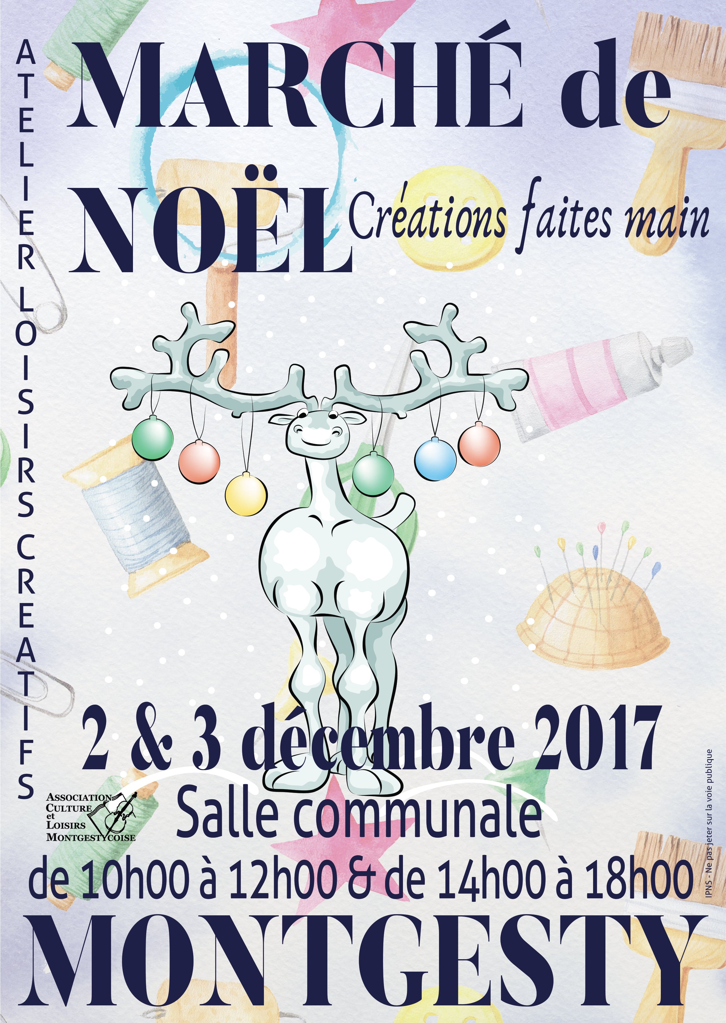 L’Atelier Loisirs Créatifs de Montgesty vous invite à son exposition/vente « Marché de Noël » qui se tiendra à la salle communale située dans le Bourg, le samedi 2 décembre et le dimanche 3 décembre 2017 de 10h00 à 12h00 et de 14h00 à 18h00.
