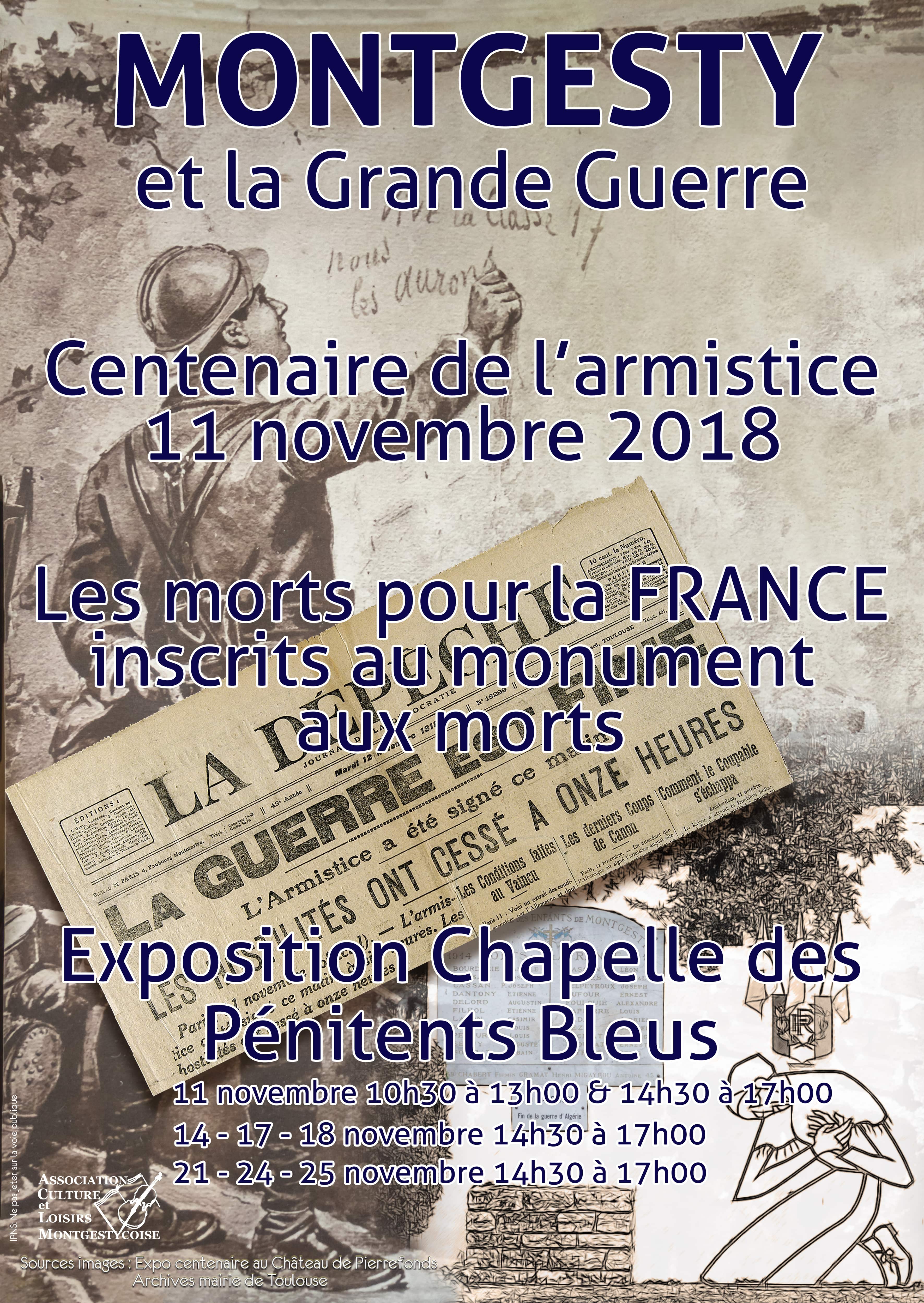 Cette exposition installée dans la Chapelle des Pénitents Bleus s’intègre dans les cérémonies commémoratives du centenaire de l’armistice du 11 novembre 1918. Elle met à l’honneur au travers de documents d’archives départe-mentales, de photographies et d’objets d’époques, les 22 montgesticois Morts pour la France dans le conflit de 1914 – 1918. Son inauguration se fera à la suite de la cérémonie commémorative au monument aux morts de la commune.