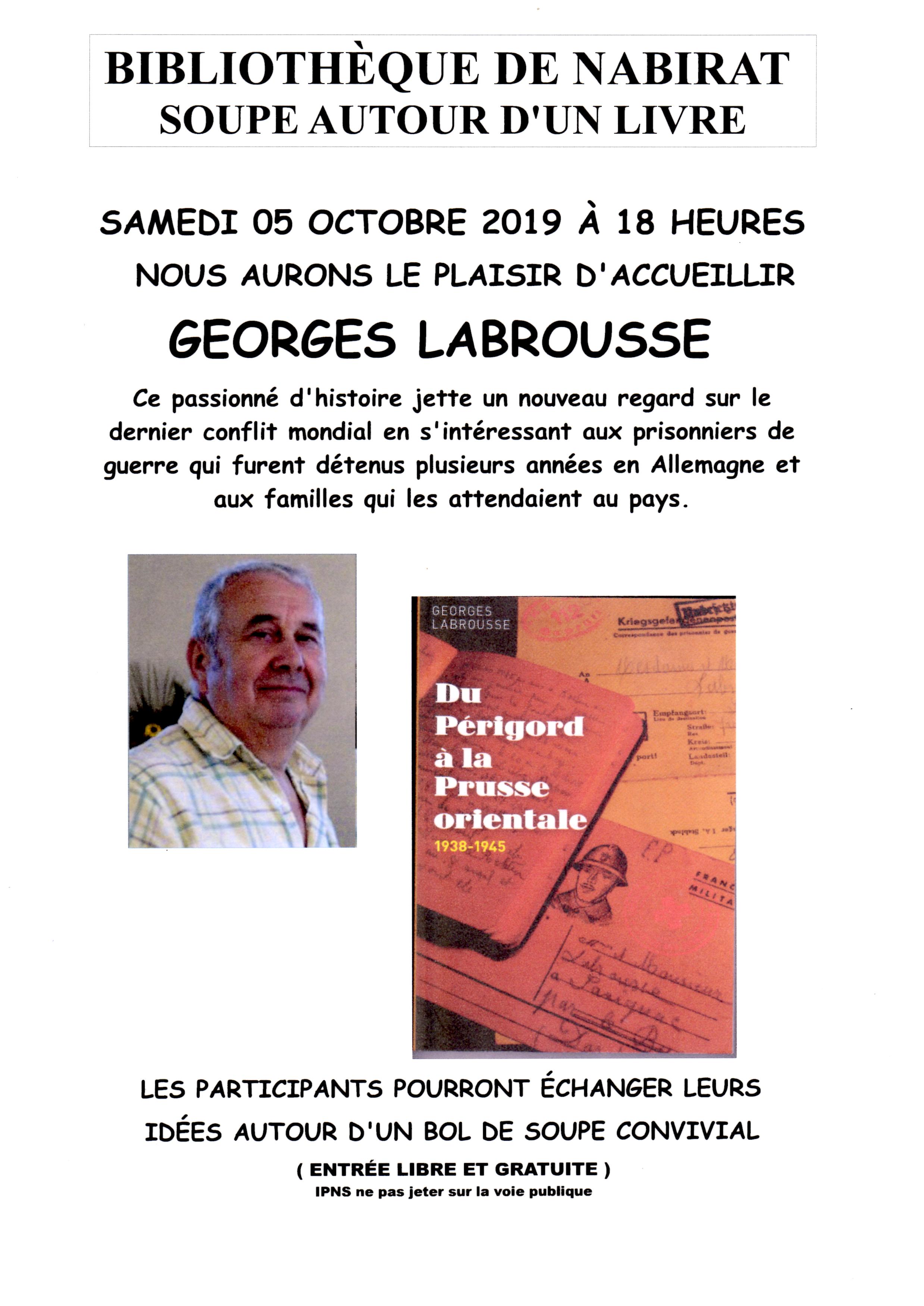 La bibliothèque municipale de Nabirat poursuit l’organisation de soirées « Soupe autour d’un livre » en accueillant Georges Labrousse. Il y a beaucoup d’ouvrages qui nous racontent le sort des soldats sur les champs de bataille de la seconde guerre mondiale, mais le livre de Georges Labrousse est original car il ne parle pas des combats avec leur cortège de morts et de blessés, il nous parle de ceux qui ont été faits prisonniers et le sont restés jusqu’à la fin de la guerre. C’est donc le destin de ces hommes meurtris qui nous est conté mais aussi celui des familles restées au pays, bien souvent dans l’ignorance du sort de leurs disparus.