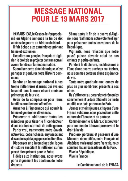 • La date du 19 Mars, jour anniversaire du cessez-le-feu proclamé le lundi 19 Mars 1962 à midi sur l’ensemble du territoire algérien mettant fin à 10 années de cruels et meurtriers combats en Afrique du Nord, est désormais légitimée par la loi reconnaissant officiellement la guerre d’Algérie, votée à l’unanimité en 1999, à l’Assemblée Nationale et au Sénat.