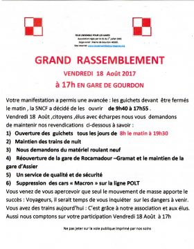 nouveau rendez-vous gare de Gourdon vendredi, 18 à 17h Publié le mardi, 15 août 2017vendredi, 18 août 2017 par asclconcores . .Nous avons obtenus l’ouverture temporaire des guichets il faut confirmer ces avancées venez nombreux c’est notre salut