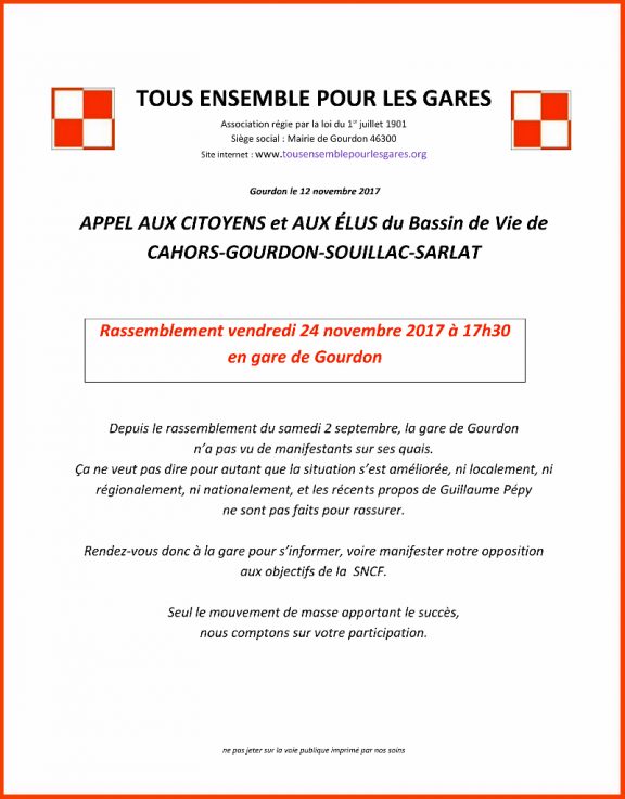 Nouvelle mobilisation pour les gares le vendredi 24 novembre à 17h 30