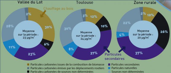 Deux périodes se distinguent nettement dans l’analyse des particules dans l’air ambiant : l’hiver et le printemps. L’hiver est marqué par de fortes concentrations de particules, avec pour la vallée du Lot une forte contribution de la biomasse. Toulouse est marquée par une contribution de la biomasse inférieure. Au printemps, la contribution de la biomasse chute sur les trois sites de mesures.