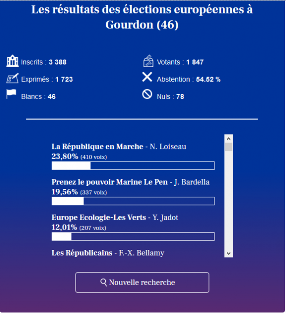 Dans un paysage politique différent, la liste de la majorité présidentielle fait mieux que résister, elle arrive en tête on l’a vu à Cahors, Figeac mais également dans les principales autres villes, Gourdon, Souillac, Gramat, Saint-Céré où elle réunit le plus de suffrages en totalisant 26,90 % des votes.