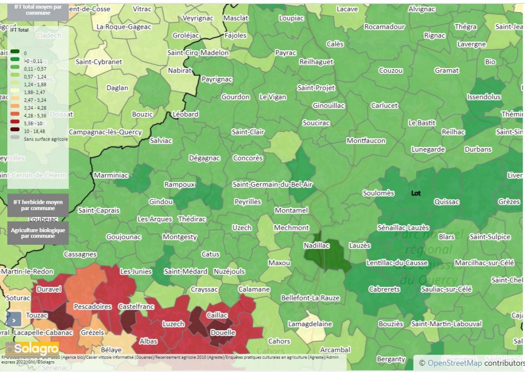 La carte donne la valeur de l’indice de fréquence de traitements phytosanitaires (IFT) communal.. Cet indice est une estimation du niveau d’utilisation des pesticides pour chaque commune française sur la base de l’assolement de la commune, du type de pratique (conventionnelle ou bio) et des IFT régionaux de référence issus de données statistiques ou locales.