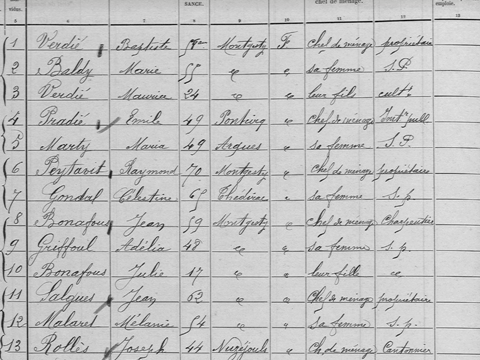 On voit que, par exemple, Emile PRADIE, 49 ans, né à PONTCIRQ était instituteur public de Montgesty en 1911, Thérèse NADAL, 39 ans, était épicière au Bourg. Il y avait deux prêtres (Etienne RAYNAL et Alphonse GIRARD), et apparemment 3 épiceries…En tournant les pages, on retrouve toutes les familles de MONTGESTY (et de ses hameaux) avec âge, profession et lieu de naissance.
