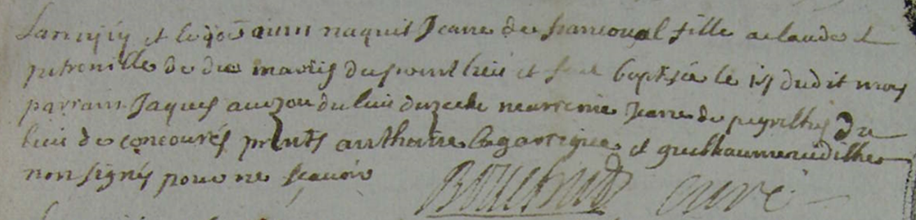 « L’an 1717 et le ( ?) naquit Jeanne (du) FRANCOUAL fille à Claude et Pétronille (de) DIL, mariés du présent lieu et fut baptisée le 17 du dit mois parrain Jacques AVEZOU marraine Jeanne (de) PEYRILLES du lieu de CONCORES présents Anthoine LAGARRIGUE et Guillaume VIDILHES non signés pour ne savoir »