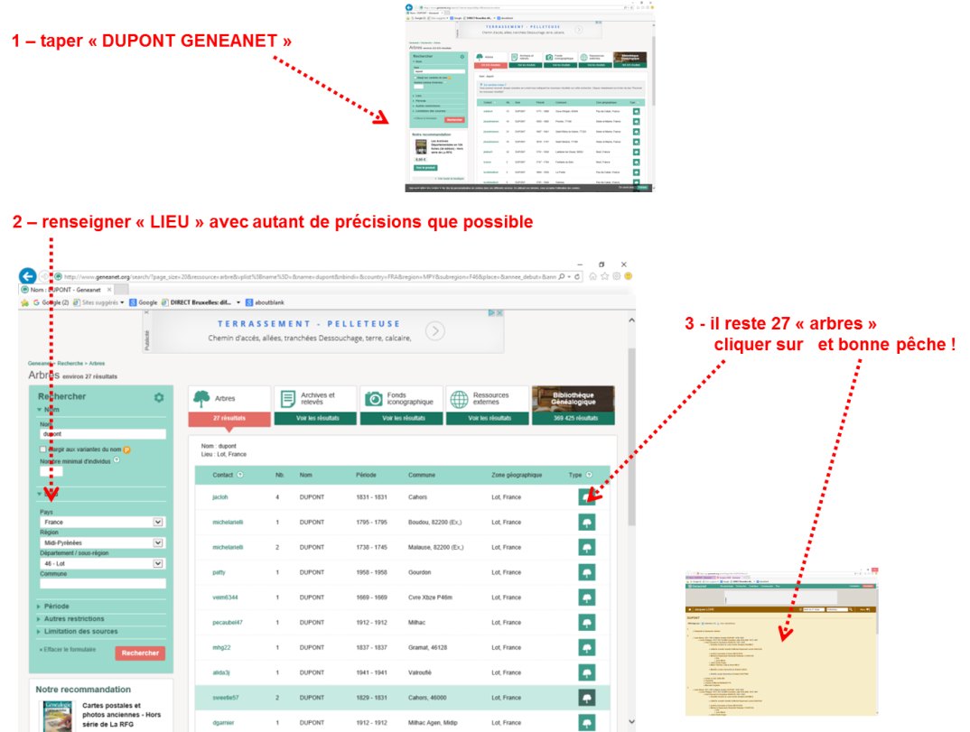 Par exemple « DUPONT GENEANET » Il apparait un tableau avec tous les DUPONT ayant fait l’objet de recherches par les participants dans le monde entier.