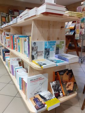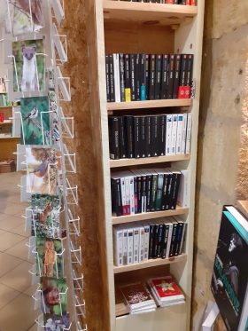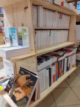 Petite présentation des différents espaces de la librairie réalisés ces derniers jours grâce au travail d’artisans locaux (ébénisterie Maury au Vigan) et à l’huile de coude.