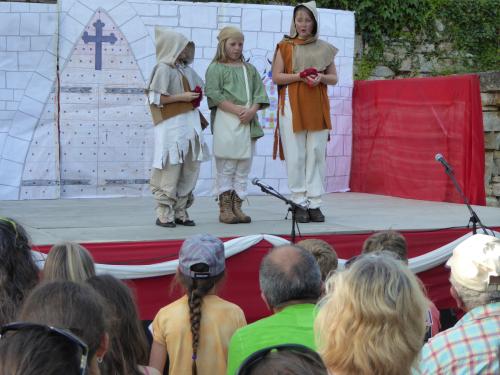 Les enfants de Peyrilles ont donné une excellente représentation théâtrale » Les aveugles de Compiégne » Leur jeu d’acteur avait beaucoup de naturel et de présence la mises en scène le rythme la musique tout était en accord pour nous embarquer dans ce bel environnement qui est l’esplanade du château de Peyrilles.